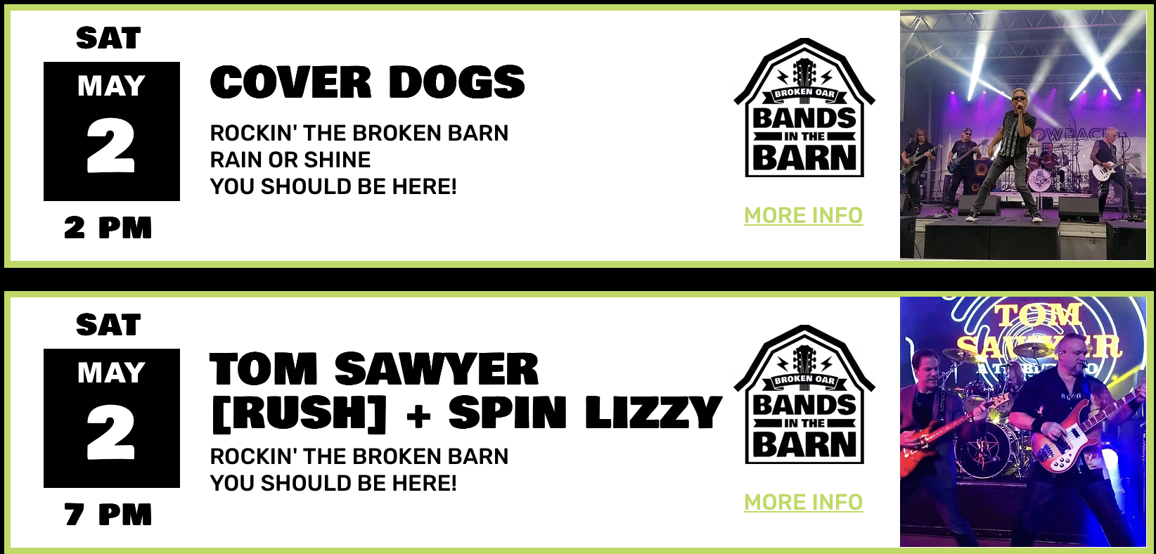 Cover Dogs (afternoon) Tom Sawyer (Rush) + Spin Lizzy (evening) Saturday, May 2, 2026 2:00 PM 11:59 PM 14:00 23:59 Broken Oar 614 Rawson Bridge Road Port Barrington, IL, 60010 United States (map) Google Calendar ICS learn more