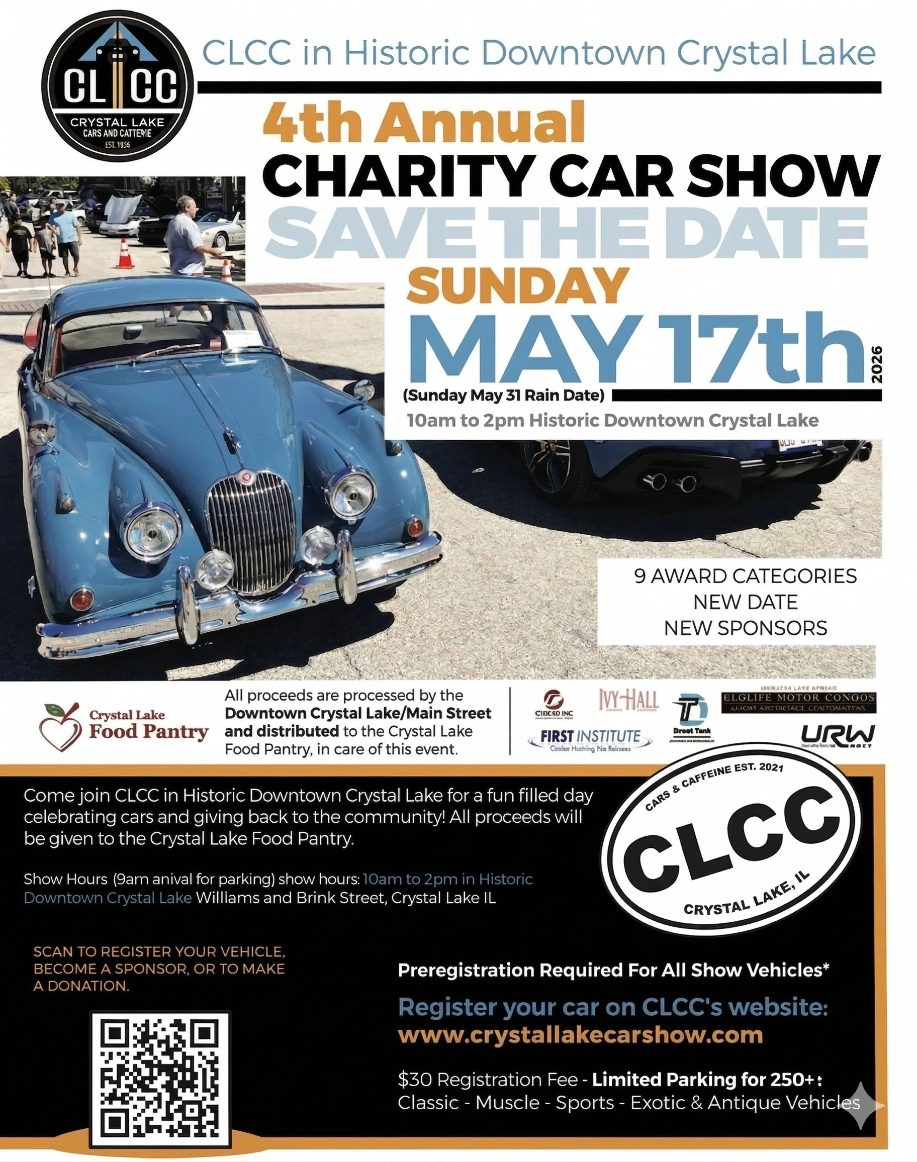 Rev up your engines and head to historic downtown Crystal Lake on Sunday, May 17th (rain date May 31st) for the 4th Annual Cars & Caffeine Charity Car Show! From 10:00 AM to 2:00 PM, three blocks of the downtown area will transform into an incredible open-air showroom featuring over 200 vehicles. Spectators can park free in the Metra lots and come enjoy a high-octane day viewing everything from classic hot rods and vintage muscle to modern exotics, European luxury, and motorcycles, all while taking advantage of the fantastic local shopping and dining. Car and motorcycle owners of all years, makes, and models are invited to showcase their rides by pre-registering for $30. Nine trophies will be awarded this year! Most importantly, this event is a community mission: 100% of the net proceeds go directly to the Crystal Lake Food Pantry to help families facing food insecurity right here in McHenry County.