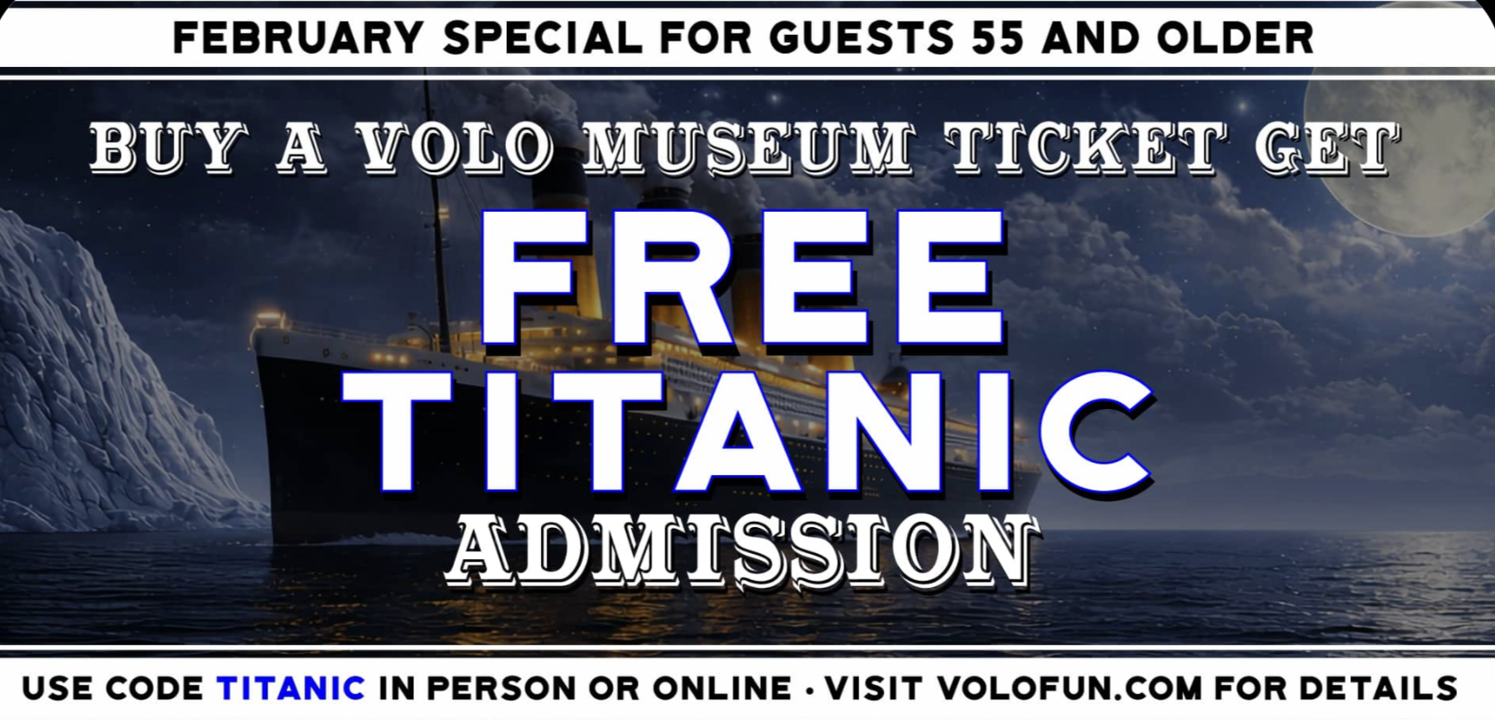 Buy a Volo Museum ticket and get FREE Titanic admission when you use promo code TITANIC!