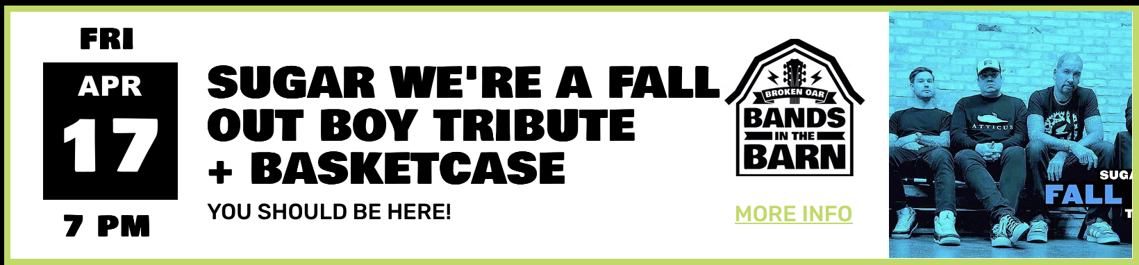 Sugar We're a Fall Out Boy Tribute + Basketcase (Green Day) at The Oar Friday, April 17, 2026 7:00 PM 11:59 PM 19:00 23:59 Broken Oar 614 Rawson Bridge Road Port Barrington, IL, 60010 United States (map) Google Calendar ICS learn more