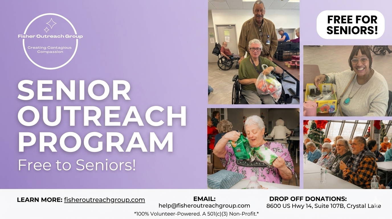 Fisher Outreach Group is a 100% volunteer-run nonprofit in Crystal Lake dedicated to supporting local families, seniors, veterans and the homeless, providing food, clothing, household necessities and school supplies, while operating programs like the "Adopt A Grandparent Farmers Market" to combat food insecurity for seniors and veterans.